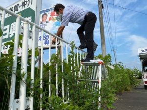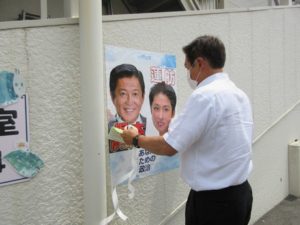 7月21日(水)、昨日今日は、梯子や三脚を使った場所でのポスター貼り替え作業が中心。 一段落。 明日からの連休は遊説活動が中心。 街頭演説も積極的に行います。 -