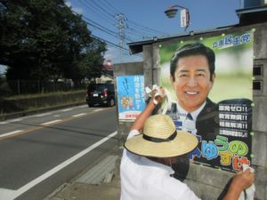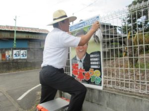 9月1日(火)、10市町のポスター貼り活動も地道に進んで。 この場所は高校の先輩宅。 県議・市議と日頃お世話になっている仲間と並んで掲示。 -
