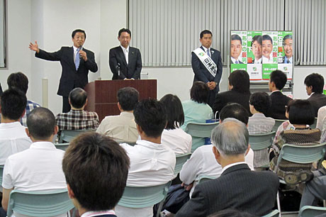 6月10日(月)、石神井公園区民交流センターにおいて「あみの辰夫君を励ます会」が開かれました。日本維新の会からは平沼赳夫先生が応援弁士としてお越しをいただきました。このたびの都議会議員選挙には、我が党からは35名の候補予定者がいます。私もひとことご挨拶を申し上げました。