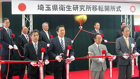 埼玉県衛生研究所新庁舎完成記念式典には上田清司埼玉県知事もお見えになり、一緒にテープカットをさせていただきました(写真上)。この研究所は旧県立吉見高等学校跡地に建設されたもので、県民の健康に重大な影響を及ぼす健康危機管理に対応し、埼玉県の衛生行政の中核を担う施設(写真中)です。