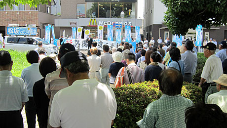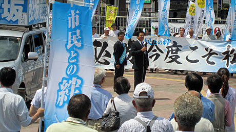 6月29日(日)、松坂よしひろ候補の出発式。東松山駅、高坂駅共に多くの支援者がかけつけ熱気に包まれながら東松山市長選挙の火ぶたが切られました。私は応援演説後、遊説カーでマイクを持って支援を呼びかけました。