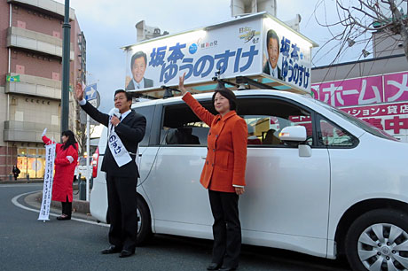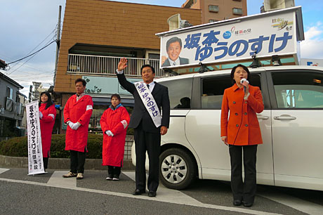 先日は民主党小宮山泰子候補者と共にマイクを持って応援演説。生活の党松崎哲久北関東単独比例候補者も東松山市を「小選挙区は坂本祐之輔候補をお願いします!」と遊説カーから応援いただきました。