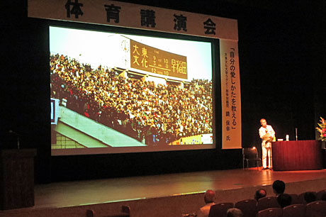 7月11日(土)、東松山市民活動センターにおいて東松山市民総合体育大会総合開会式が挙行されました。開会に先立ち大東文化大学ラグビー部鏡保幸特別顧問から「自分の愛し方を教える」と題して講演をいただきました。