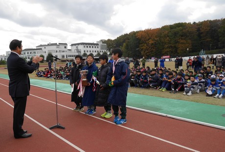 優勝杯返還は東松山市陸上スポ少A・野本ミニバスA。大会会長として出席。