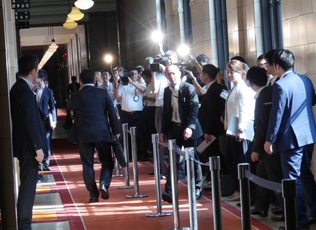 理事会室前には多くの報道陣が詰めかけていました。