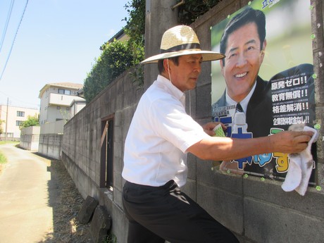 8月11日(火)、終日ポスター貼り。 今日は暑かった!!と感じている方は多いでしょうね。 40度超えました! ポスターを貼るときに麦わら帽子をかぶるだけでかなり楽です! 活動報告 URLをコピーしました! 「9条の会」街頭演説 汗が目に流れ落ちる!