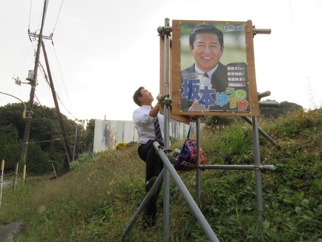 10月28日(水)、遊説&ポスター貼り活動。 なかなか傾斜地。 同級生と二人かかりで設置。 同級生はいつまでたっても同級生でありがたい! 活動報告 URLをコピーしました! 坂本さんかい! 小京都小川町の名月