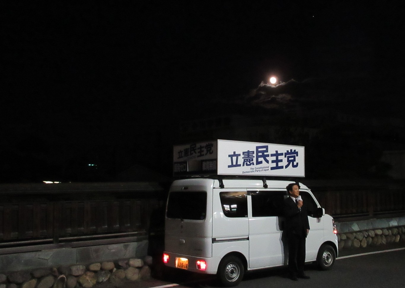 10月30日(金)、ご挨拶にお伺いしてポスター貼り。 私も一揃いセットは用意してあるものの、手袋や消毒液を出していただき申し訳ない。 話しも弾んでうれしいひととき。 そしてまちかど街頭演説。 日が落ちるのも早い。 小川町は歴史を感じる屋敷も多く、中秋の名月に映えます。 活動報告 URLをコピーしました! なかなか傾斜地 日々の出会いに感謝!