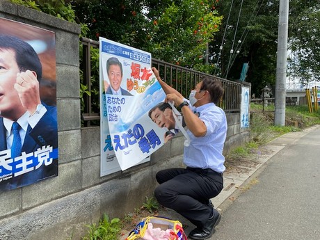 6月22日(火)、最近作成したポスターの色があせるのが早く、あちこちからご心配の連絡をいただいて貼り替え作業もかねての遊説活動。