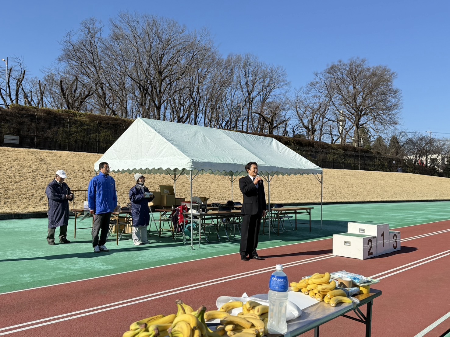 「第1回東松山3時間耐久リレー&ソロマラソン」が陸上競技場で開催され、私はスポーツ協会会長として激励のご挨拶。晴れやかな青空の下、市内外から参加された多くの選手の皆さんが元気よく駆け抜けていきました。私はスターターを務めさせていただきました。