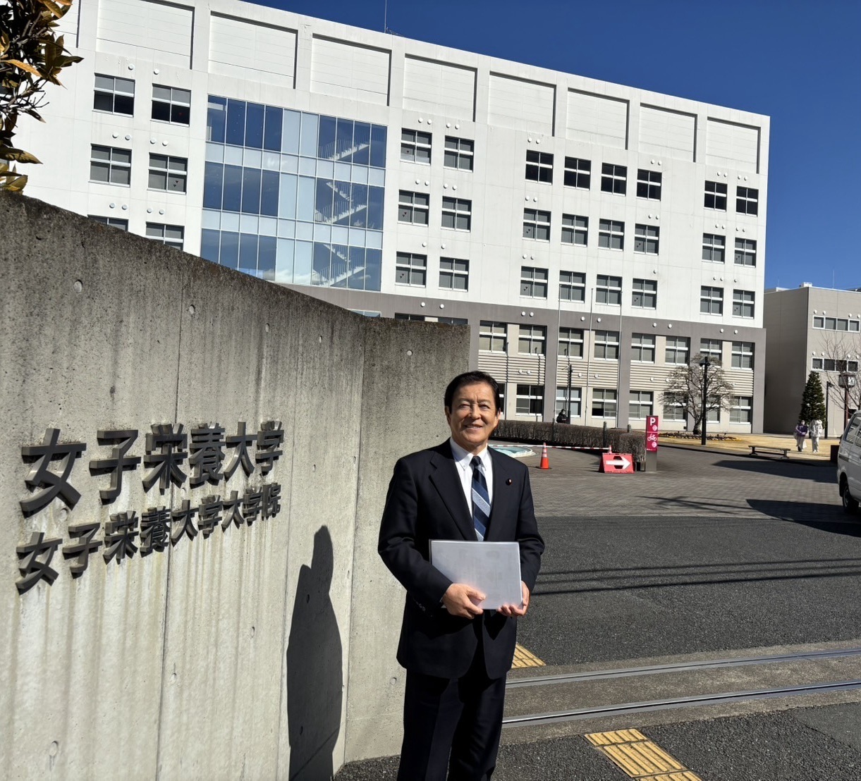 坂戸市にある「女子栄養大学」において、学長から学校給食やその無償化、そして管理栄養士や栄養士の皆さんのおかれている現状について、課題や問題点等を説明していただきました。