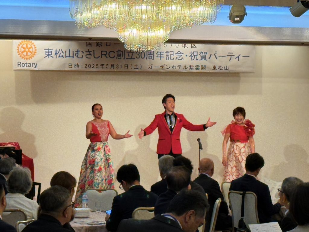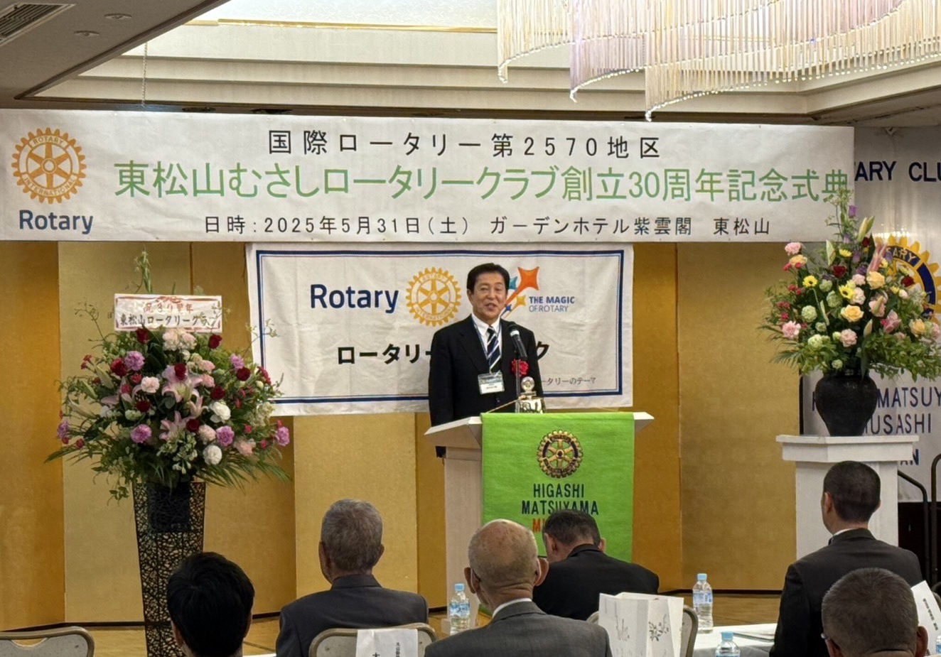 「東松山むさしロータリークラブ創立30周年記念式典」でご挨拶。活動紹介のスライドには、30年前、私が東松山市長の時の写真も紹介されました。若い!