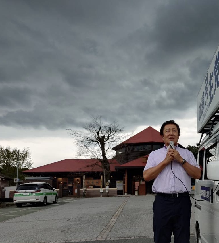 今日は遊説活動とご挨拶伺い。夕刻になって街頭演説中、急な雷雨となり中断。ここのところ天候が不安定。激しい雨ではやむまで遊説も少し休憩です。 -